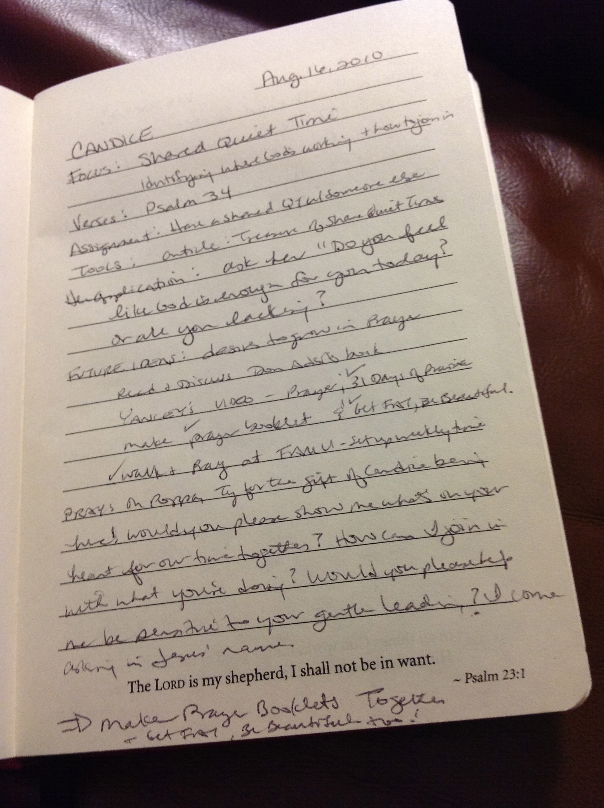 And when it comes to discipling I have found keeping a record of what I do with people is unbelievably helpful! Not only does it keep me from the embarrassment of, “Um, I think you already shared this with me last year…” but is it ever helpful for discerning patterns where the Lord is at work in a person’s life and at the end of our times together I can give the person I meet with an outline of what we did so she can refer back to this when she starts to meet with someone else to pass on what was passed on to her!!!