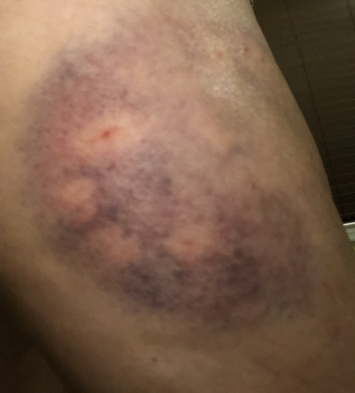 By the time I stumbled through my front door, the wound was discolored. Purple blotches surfaced, then angry red streaks spread. I flew to Colorado as planned—but by the time I arrived, a deep purple bruise the size of a salad plate adorned the side of my leg.